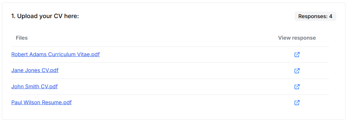 When you view the results of a File upload question, you will find a list of the files uploaded in the order the responses were submitted.