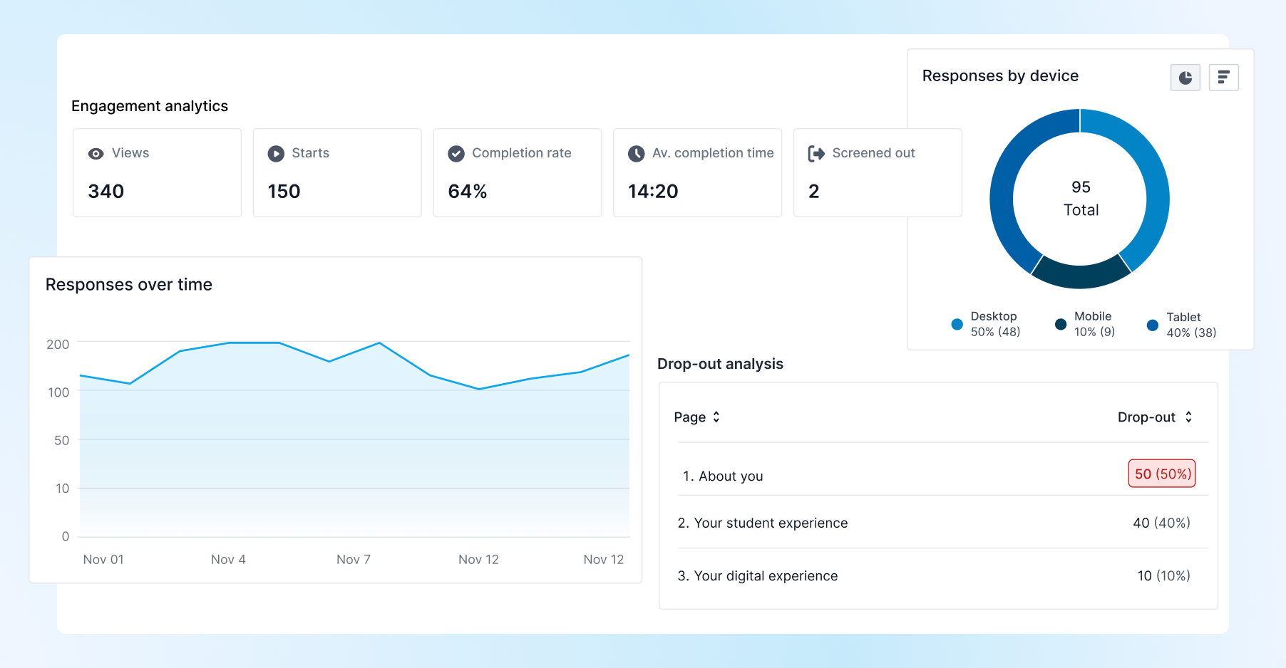 The new Insights page gives you instant answers. You’ll now see key stats like views, starts, completion rate, drop-out analysis, device usage and responses over time. You can use this data to help you make better decisions about your survey design, timing, and distribution.
